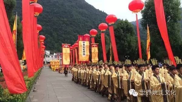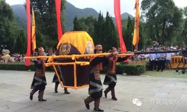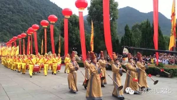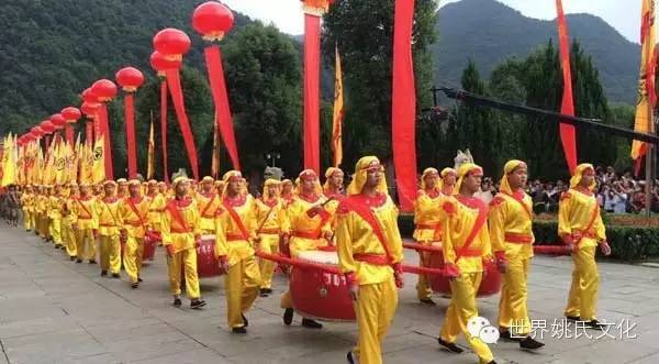 2015湖南省公祭舜帝大典:8点45分,在3面公祭大旗引导下,祭祀队伍经金水桥、神道缓缓步入祭祀广场,走在前面的长号队、锣鼓队奏响悠远绵长的古乐。随后是手持56面仪仗彩旗队伍,象征全国56个民族共祭人文始祖舜帝,传承舜帝“德孝”精神。