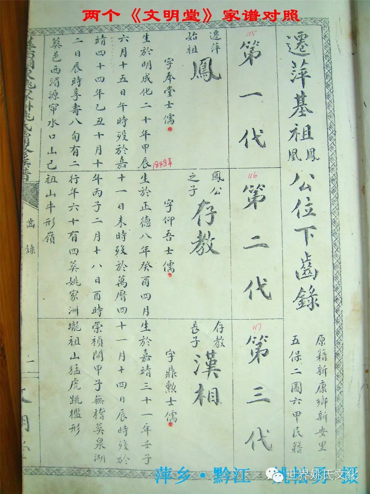 至于“文明堂”的由来,大家也说不清楚,只知道是湖广镇四川来的麻城县孝感乡石垣子来的,又说祖上是江西的,明季祖以武功受大明国封赐,四川重庆卫黔江千户所,家谱已早遭火灾烧掉了,据说还存四部残本,保留在几家手中(我没看到)有一部存在原在市图书馆工作的宗亲家中保存,现有2005年版家谱中的一些序和瓜虅图便是从上面原封不动抄下来的(附后)只知道入川祖环公以下的情况,以上就很模糊不清楚了。