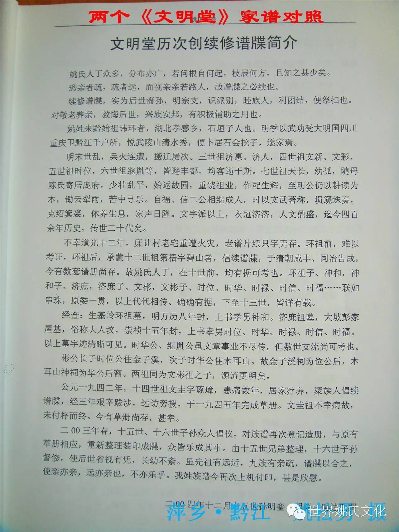 仲秋之时,在网上听姚泽林宗亲介绍,他来自重庆黔江姚姓,也是“文明堂”堂号,本人感到很惊奇,也很激动,因为我们是萍乡湘东姚家洲“文明堂”姚姓,还听说他们姚姓近万人,也是来自江西,于是我想急于要去黔江一趟,一来那么多姚姓,还没有去联谊一次他们也没有参加老四川姚氏宗亲联谊会,,二来是“文明堂”堂号是否和我们“文明堂”是否一家。