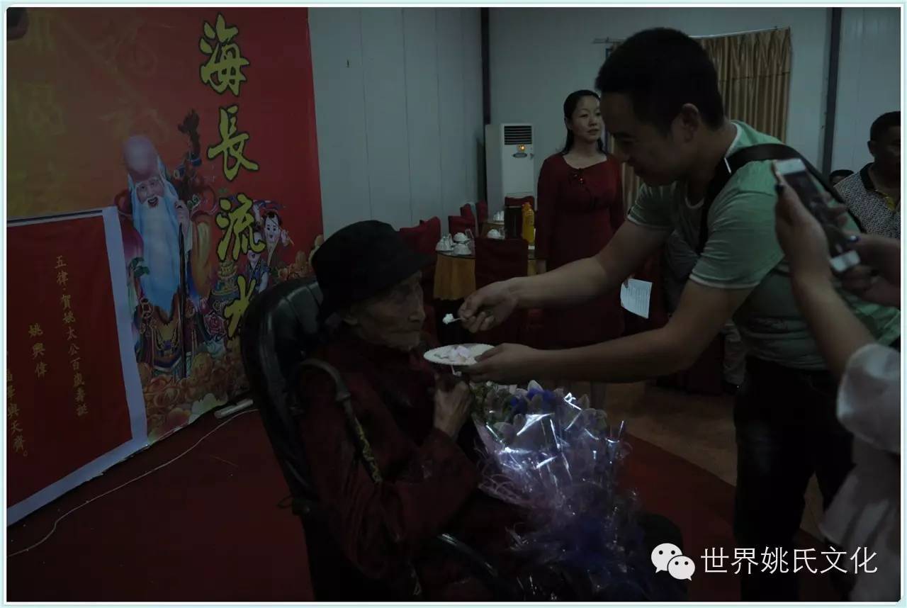 主持人宣布祝寿活动开始,首先请老寿星上台入座,全场响起热烈的掌声。然后由老寿星的儿子姚永承和弟讲话、接着老四川姚氏宗亲会会长姚松勇向老寿星姚庆云赠送祝寿红包并讲话;会长讲话完后,就由老寿星姚庆云的子、孙、曾孙向老寿星拜寿并赠送祝寿红包,子孙拜寿完后,就点燃生日蛋羔的腊烛并齐唱:祝你生日快乐歌曲、分吃生日蛋羔。最后由老年协会文娱队向百岁老人敬献花篮并进行了文娛表演。