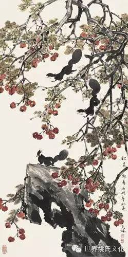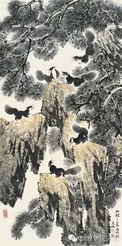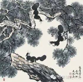 我喜欢的也正是他那充满顽童般稚趣却焕发着特有灵性的松鼠。他善于运用传统中概括的手法,寥寥数笔便刻画出各种活动中松鼠姿态,达到形神兼备,其运笔雄健流畅,墨色干湿浓淡相宜,画面高雅而情趣盎然。他笔下的松鼠或嬉戏于丛林间,或相逐于野花杂草中,这小生命是山野的精灵,其生命力顽强,生性机警,形态活泼,总让人激起对生命的种种亲和之感,给人无限的遐想与感染,也使我感受和理解了画家在他的绘画作品中将人生与艺术完美结合,以作品抒写生命灵性的乐趣、美感与境界。