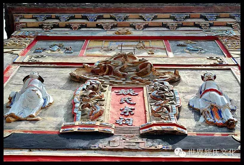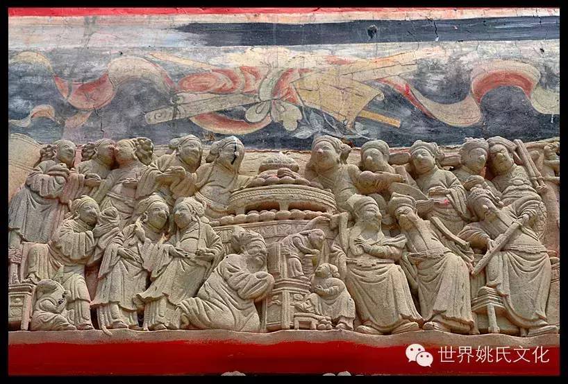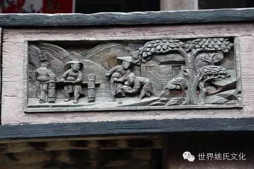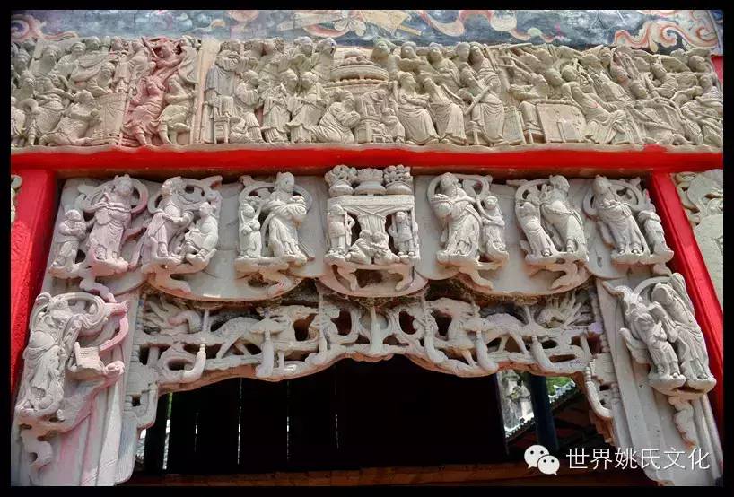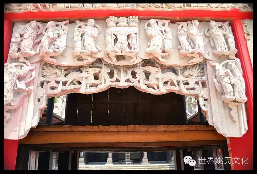 往里走,高高的牌坊宽23米、高18米,面积300平方米,牌坊正中下面是两开宽2米、高2.4米的木板大门,也是人们进出祠堂的必经之路。“整个牌坊共有十五组完整的石灰塑像,几乎都是历史典故,如草船借箭、截江夺阿斗、姜太公钓鱼等。牌坊的顶尖两头巨象对顶着一个‘寿’字,预示姚氏宗祠的子孙们如同大象一样寿高。”姚老师说,经过多年的风吹雨淋,有些字画已经模糊不清,让人十分痛心。