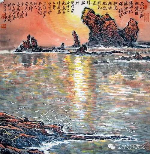 最后我要谈谈《雨后石岛》这幅压卷之作,这是最获我心的一幅画。在满天乌云的隙缝处太阳光透射出来,照射在岛上工厂烟卤上和港湾停泊的船上,是那样的耀眼明亮,给人一种雨过天晴,清新舒畅的快感。“雨后复斜阳,关山阵阵苍”!画家运用西画的手法,把视线压得很低,整个石岛工厂和大海只占画面的四分之一,天空占了四分之三,显得那么的高旷辽阔,大笔横扫的乌云,湿漉漉地与金黄色的万道阳光,形成鲜明的对比,而又那么融洽和谐。没有高妙的技巧和熟练的笔墨功夫,是很难取得如此效果的。这是洋为中用、国画创新的最好例证之一。纵览姚治华同志这些绝妙佳作,总的感觉是,他把中国画的水墨技法,发挥到了极致,横涂竖抹,恣意挥洒,大气磅礴,水墨淋漓;润含春雨,干裂秋风;浓淡合板,气势豪雄。我想借用杜甫的两句诗:“元气淋漓幛犹湿,真宰上诉天庭泣”来概括它,是最恰当不过的。