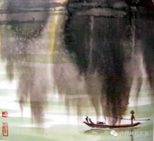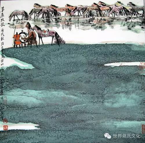 在姚治华同志的众多成功的山水画中,可以分成若干系列来欣赏品味.第一类是放笔挥洒、水润墨章、抒情系列,如《庐荡飞鹤》、《洪湖芦荡》、《漓江夜曲》、《秋渡图》、《湖滨饮马》、《漓江晨曲》、《高原情》、《青海牧歌》、《漓江情》、《草原放牧》、《丝路驼铃》、《静静渡口》、《风雨欲来》、《祁连放牧》等等一大批精彩的画幅,都是放笔挥洒,大量用水,水墨淋漓,墨彩交融,以其熟练的技巧,恰倒好处地控制笔路和墨色,达到所要追求的效果,很多画幅,由于大面积的泼墨,水墨色饱满融合,稍施盐粒,形成一种特殊的调子,富有一种浓郁的抒情风味,有的画面恬静幽深,有的静中有动,动中有静,呈现出一种悠然意远的境界,令人赏心悦目,百看不厌,拿《风雨欲来》一画说,地平线压得很低,大片天空被乌云所笼罩,泼墨洒盐的效果,大有风起云涌,“黑云压城城欲摧”之势,只留下一段空白,衬托出放牧人使劲拉着牛群往回走。那种“风雨欲来”的气氛发挥得淋漓尽致,观后令人赏叹不止!