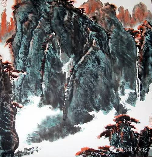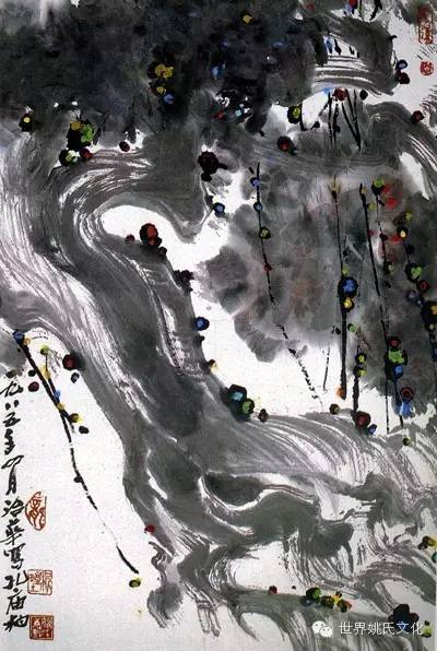 姚治华对石鲁的“以情作画,万幅画万个样;以法作画,万幅画一个样”的艺术箴言,体会最深,运用实践得最好。所以他的画总在不断的变化,不断的出新。他的画除了前面读到的那些风格外,还有一些类似版画的风格。如《东海日出》、《金殿》、《明镜谷》、《雾山牧歌》、《黄果飞瀑》、《温泉花溪》、《春水》等等,完全以浓墨干笔皴擦点缀,再以重彩层层染积;有时笔墨浓重古拙、着色板块鲜明,竟如套色版画的趣味。这跟他搞过版画的创作的影响分不开。在反复观赏治华同志的众多画作中,使我最为倾倒和怦然心动的还有《雨后石岛》、《风雪寒林》、《阳春三月》等作品。《风雪寒林》描写东北雪原的一排高耸的参天树木,在风雪的狂扫中,枝叶更显苍劲。远处雪原上几匹马车在驮运木料,衬托出隆冬的活力。画家似乎不经意地寥寥几笔,纵横斜扫,就把风雪寒林的气氛营造出来了。如此神来之笔,怎不令人惊叹!《阳春三月》,在一排高高的春意醉人的杨柳丛中,透露出汪汪水田和村庄,农村春耕正忙呢。这幅画和其他各画大异其趣,又是一种创新,这其中似乎也有一点可染先生的味道。