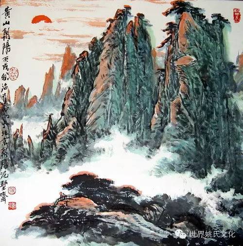 第二类是黄山风景系列。治华同志11次上黄山,参与创办了黄山写生画院,亲自担任院长,可以想见他对黄山的爱恋感情,所画黄山画幅也最多。如《清凉世界》、《旭日》、《云雾朝阳》、《泼墨山水》、《黄山图》、《西峰云涌》、《天门奇观》、《崖岩峥嵘》、《山中雾》、《朝阳》等等。画家运用各种表现手法,极力描绘黄山的奇峰、怪石、云海和它的朝夕阴晴变化,浓妆淡抹、气象万千。值得一提的是《清凉世界》特大横幅,以清凉谷为中心,周围群峰环峙、挺拔峥嵘,层云滚滚,波涛汹涌。这幅山水画的表现技法基本是传统方法。是勾皴烘染之后,敷以汉赭、石青、石绿色彩,层层积染的效果,所以显得分外厚重而华滋。由于山峰的浑厚,衬托出云海的十分厚重。这是治华同志运用传统画法的成功范例。《旭日》一画,勾皴极为简练,加阴阳皴染,受光处染以橙黄色调,半轮红日,朝晖的气氛便出来了。这是一种淡装素裹的表现手法,与前一幅《清凉世界》的大青大绿形成鲜明的对比。真是浓妆淡抹,都各极其妍。