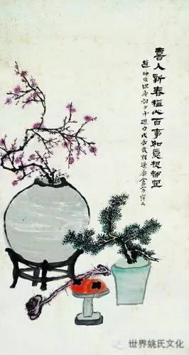 姚茫父 《岁朝图》 立轴 149×80厘米 纸本水墨设色 1928年 姚茫父的绘画理论散见于《艺林虎贲》《复邓和甫论画书》《题画一得》,以及大量诗词创作与书画题跋中,尤以为陈师曾《中国文人画之研究》所作序言最具提纲挈领之效。其中对于“画家多求之形质,文人务肖其精神,生死之分两途,所由升降也”的论述与陈师曾如出一辙。虽然姚与陈皆从“美”与“真”的辨析中体现出对于文人画传统的高度“自觉”,但是姚茫父无疑更在意绘画作为一种心机性灵的自然流露,以及绘画与文人较为宏肆的精神学养间的必然关系,所以才有“予甚愿画之,至于文而一变于道也”的主观追求。基于画与道的关系认识,姚茫父坚决反对“美术”的称谓,认为“画非术也,学也,且非学也,性灵也,文章也”。而由此亦可想见,在姚茫父的画学认识中,通过诗词文章的陶冶与金石文字的学问滋养,进而对道有所体认,并以性灵的自由抒发而外化为具体的绘画形式,这才是“外家画”高蹈所在。基于此,姚茫父在《题画一得》中表示出了对于美专书法教育的意见,认为其法与文章一炉而治之不可。不唯时间不及,而设科不备,习字等于孤立……主者不谙国故,欲与言之,譬诸聋瞽。”仅此只言片语,似乎能看到姚茫父对于传统文化全面修养的重视,而对于文化根基的维护,尤其是对于文人传统文化修养完整性的强调,都是其对于传统画学体系的自觉,乃至对于整个传统文化价值体系的极力维护。