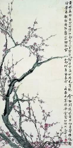 姚茫父 《红梅》 立轴 137×69厘米 纸本水墨设色 1928年 在将姚茫父置于维护传统画学价值尤其是文人画精神价值关照下的同时,尚需进一步细化对于姚氏画学乃至文化逻辑的梳理,才能相对还原一种具有代表性的,同时又是实在个体的经验。从“四王”门径入手的姚茫父,一方面强调学古的必要性,另一方面也在清末“四王”流弊中切身感受到了文人画的危机。从姚氏对吴昌硕和陈师曾的推崇来看,他对于从金石碑派书法中求“破”的尝试是抱有肯定态度的。其在《题苦铁山水》中对吴昌硕以章草勾勒兼备之法作画给予了高度评价,同时言及他的好友陈师曾: 隶分变化生章草,写作溪山意更奇。 几见缶翁书入画,勒法《月仪》见风姿。 缶翁花卉有草篆法。此山水小帧以章草为之,尤为仅见。河南李古民与予论山水云:古有勾勒皴擦之法,时贤少能勾勒者,惟朽道人能勒,最属高品。因叹为知言,时时诵之。闻者因叩勾勒,臆晰之曰:勾法篆,勒法隶耳。观此作,用勒法而少变勾剔,似章草之始变,故以索幼安《月仪帖》状之,至隶有三变,不出波折者隶古,波折者隶分,变波折为勾剔者隶楷也,而章草实开其先矣。缶翁画用书法,与画史异。而书法源流多未明,故复详之。 在姚氏看来,吴与陈超脱画史之上的原因,正在于他们能以篆隶之法入画,方圆相“破”,甚至静穆与野逸共治一炉而成浑脱苍茫志气,如陈师曾兼采麓台(王原祁,号麓台)石涛之长。在中国画学系统中,“破”是一种寻求蜕变的他山之玉,绝非是对于本体的颠覆。所以在姚茫父的画学逻辑中, “四王”仍然是文人画门径所在,“野而终不撒也”的石涛只能作为“破”的旁参借经而“终非乡愿”。学者如直接从吴昌硕入手,亦有“满纸槎枒,好奇而爱撒野,则伧气矣”的危险。只有当学者由平正之门取径正脉,扩充学养,陶冶于文章金石,并旁参各家,方能实现自我风格的创造,乃至于推动文人画的发展。