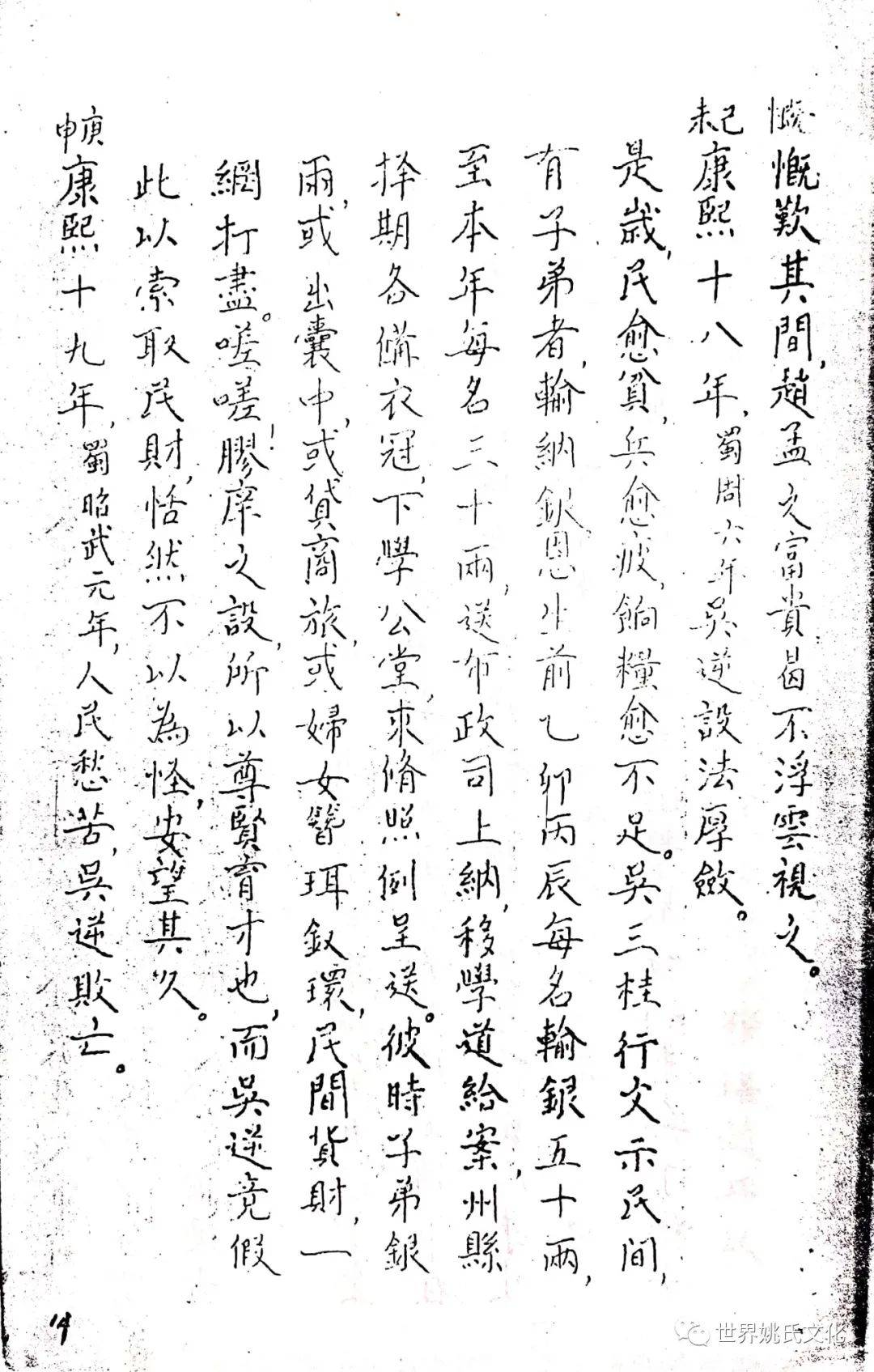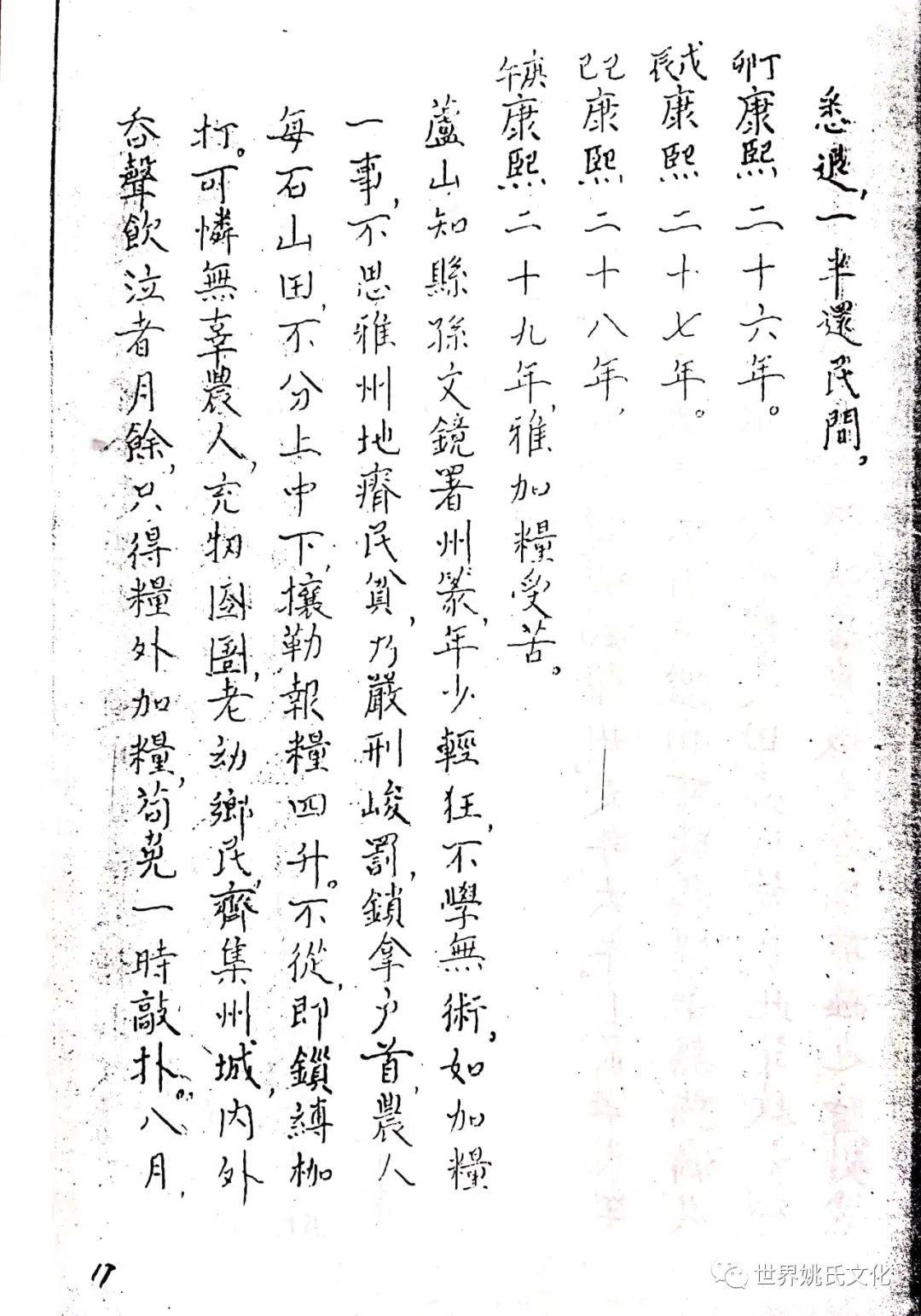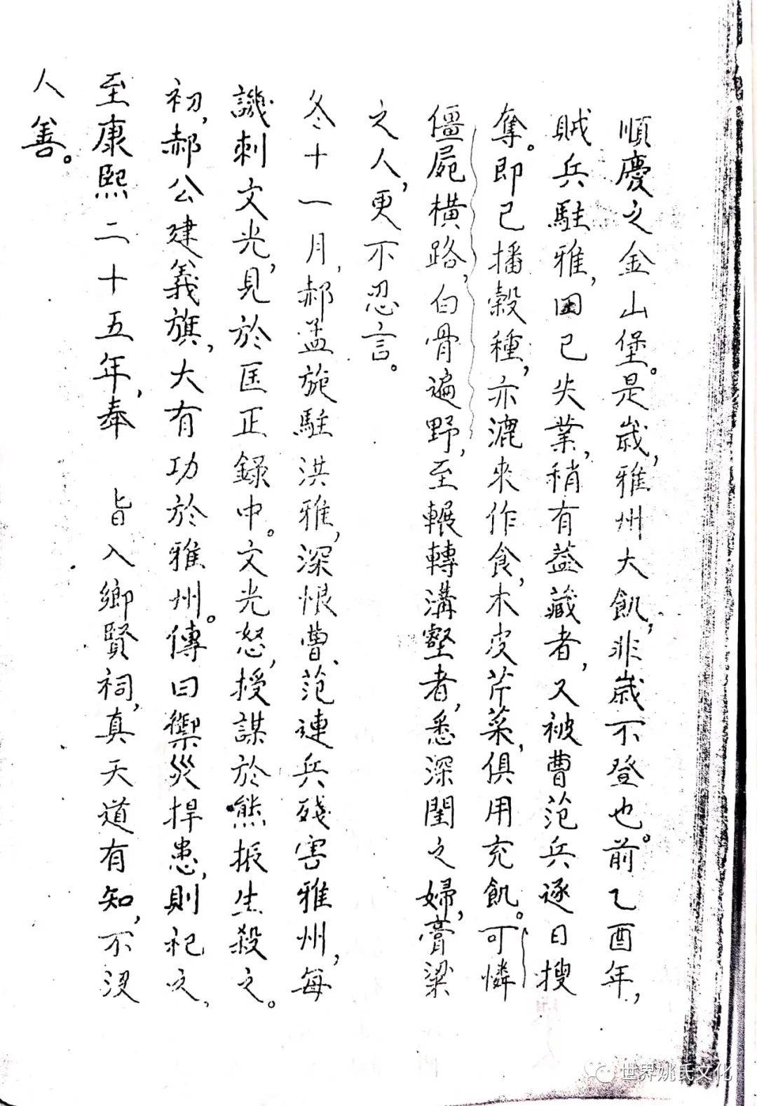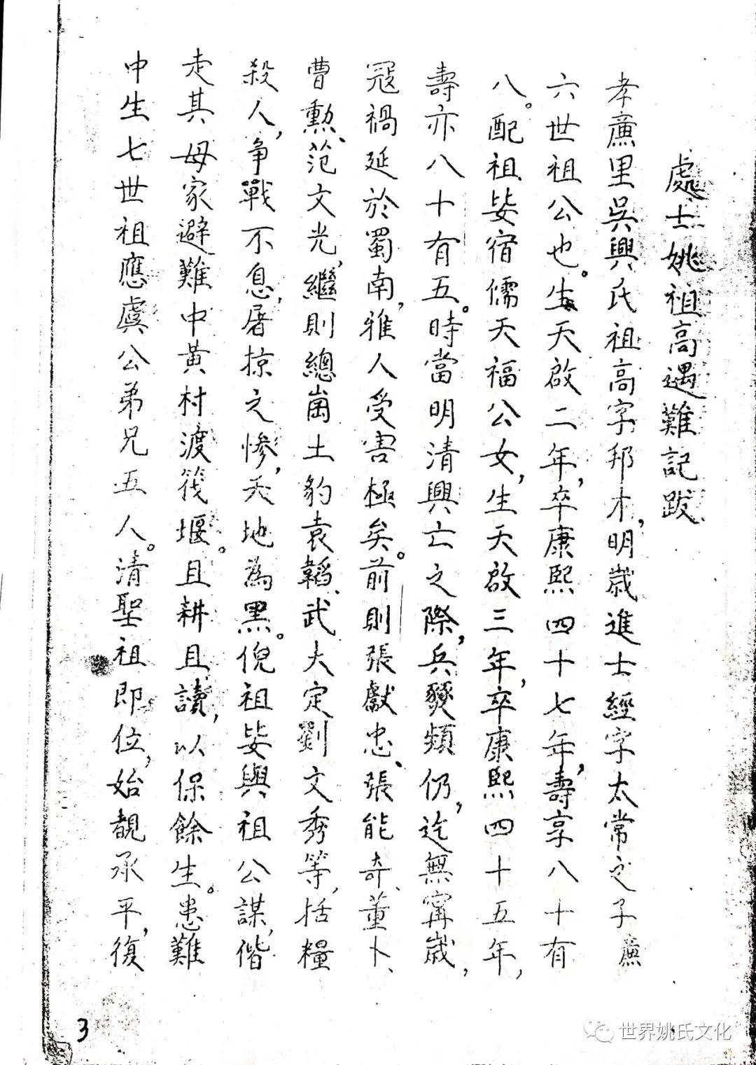 清圣祖即位,始覩(睹)承平,復返孝廉故里,享年大耊,以韦布终。尝取生平亲历浩劫,次第实录,编其年,纪其月,凡关于雅者,详书之,自崇祯元年起,至康熙四十年止,纂成一册,名曰《遇难记》。藏之箧中,俾后世子孙披读之,如见若宗蒙难艰贞之苦,或不致骄奢淫佚,数典而忘也。迄今年晋三百,云礽繁衍,多至四百余家,一线之延,瓜緜堪詠,皇天祐德,岂不然乎!慈逢县志创修之盛,征求文献,廉恭楷原本出示。