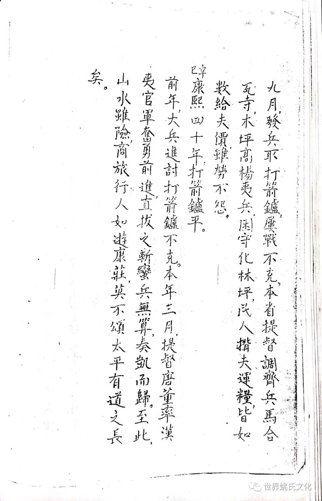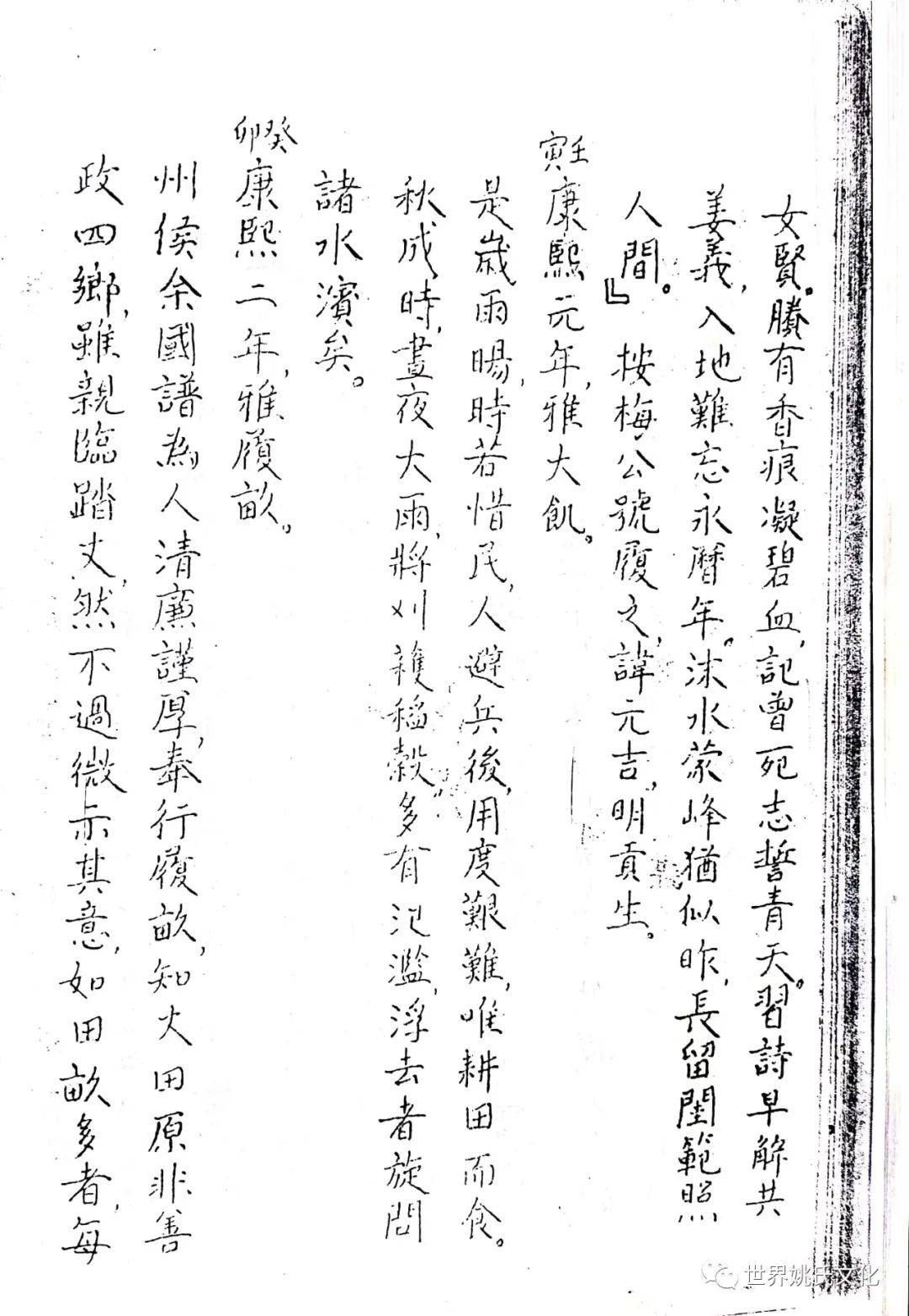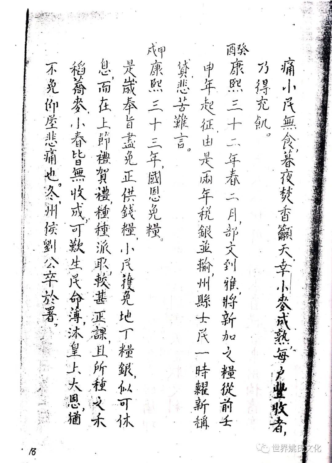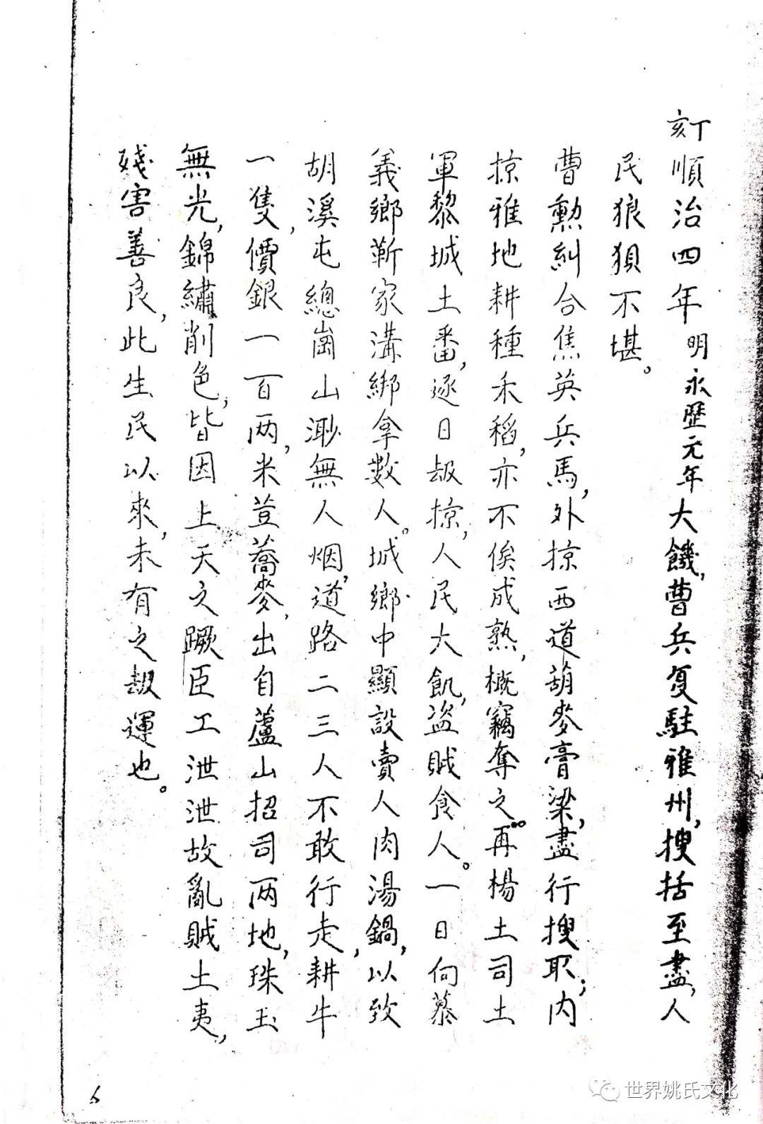 清圣祖即位,始覩(睹)承平,復返孝廉故里,享年大耊,以韦布终。尝取生平亲历浩劫,次第实录,编其年,纪其月,凡关于雅者,详书之,自崇祯元年起,至康熙四十年止,纂成一册,名曰《遇难记》。藏之箧中,俾后世子孙披读之,如见若宗蒙难艰贞之苦,或不致骄奢淫佚,数典而忘也。迄今年晋三百,云礽繁衍,多至四百余家,一线之延,瓜緜堪詠,皇天祐德,岂不然乎!慈逢县志创修之盛,征求文献,廉恭楷原本出示。