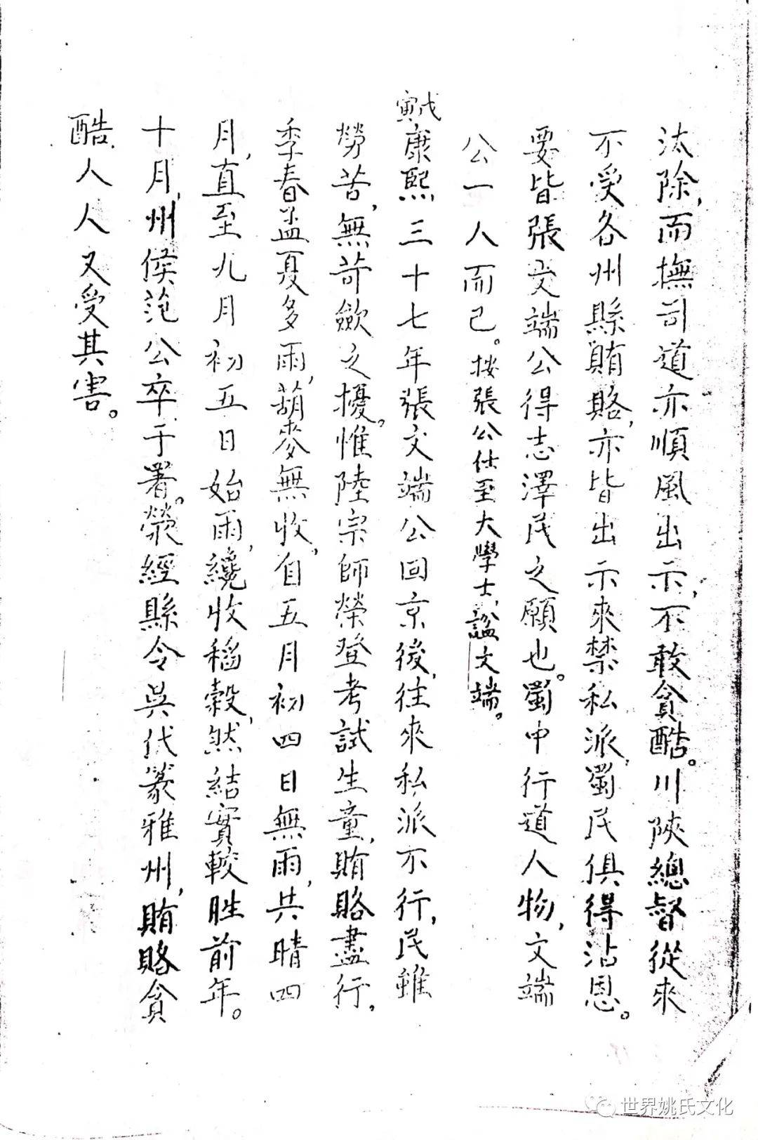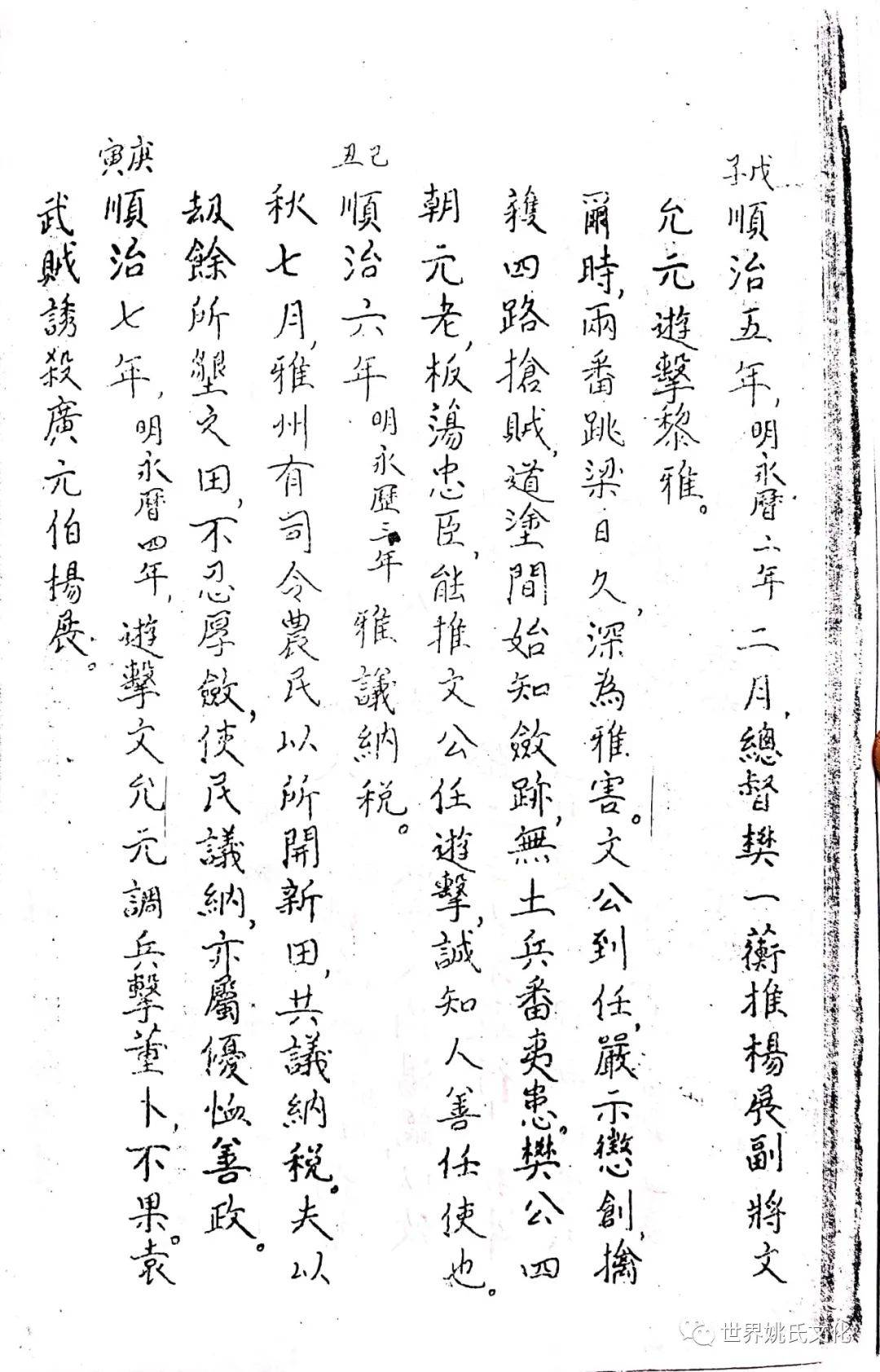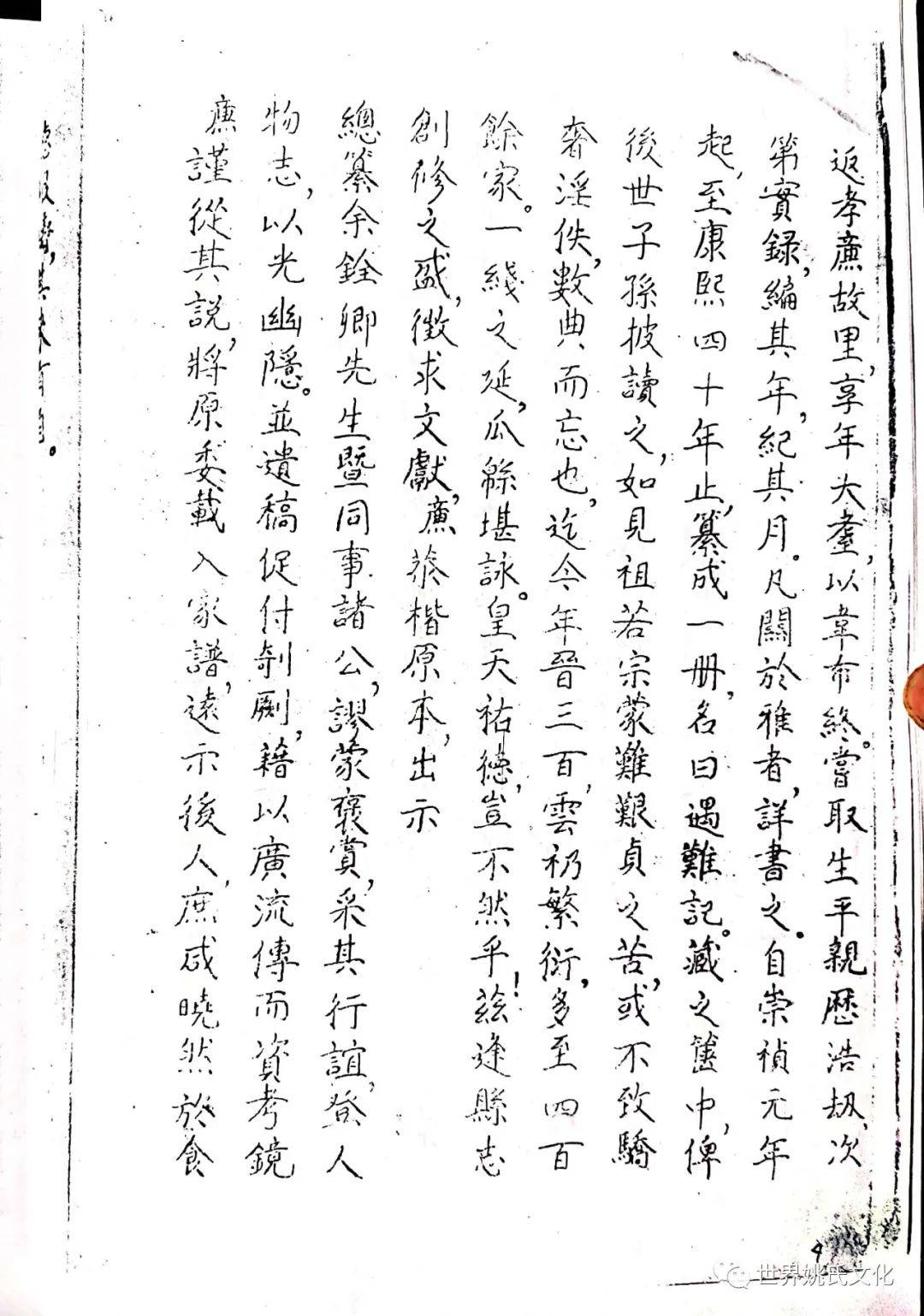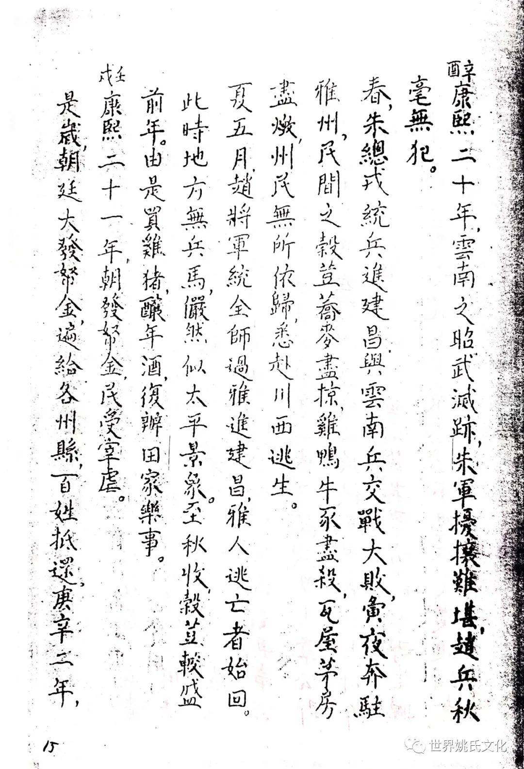 清圣祖即位,始覩(睹)承平,復返孝廉故里,享年大耊,以韦布终。尝取生平亲历浩劫,次第实录,编其年,纪其月,凡关于雅者,详书之,自崇祯元年起,至康熙四十年止,纂成一册,名曰《遇难记》。藏之箧中,俾后世子孙披读之,如见若宗蒙难艰贞之苦,或不致骄奢淫佚,数典而忘也。迄今年晋三百,云礽繁衍,多至四百余家,一线之延,瓜緜堪詠,皇天祐德,岂不然乎!慈逢县志创修之盛,征求文献,廉恭楷原本出示。