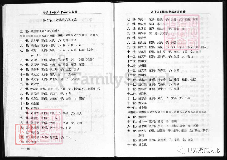 會澤挖泥寨始祖(1世) : (清) 姚世寵. 於雍正8年由馬龍遷居東川府會澤縣敦仁堂挖泥寨(現曲靖市會澤縣金鐘鎮華泥村).