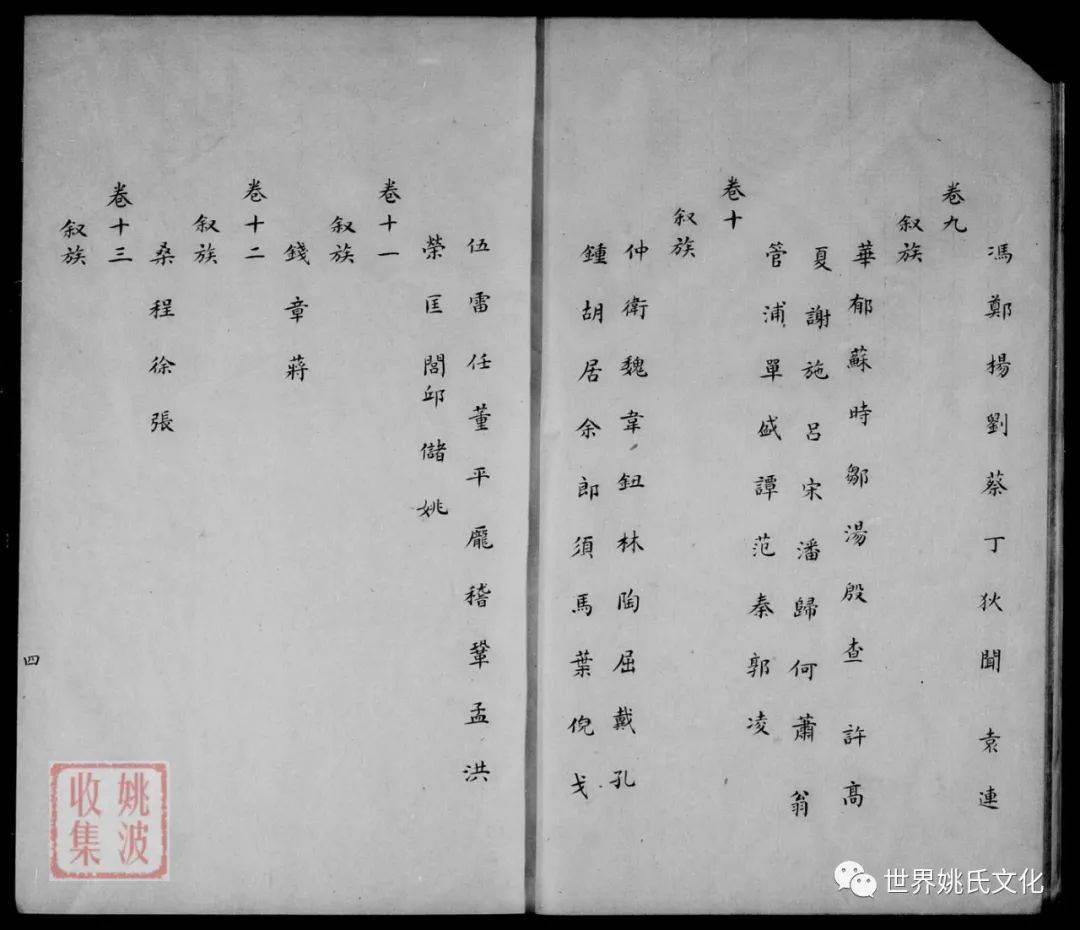 卷10~16:叙族:巫、言、富、曾、邱、冷、印、陆、朱、周、崔、翟、鱼、谈、吴、褚、曹、金、邓、龚、缪、钱、章、蒋、桑、程、徐、张、王、黄、陈、严、瞿、李、赵、顾、沈、唐、季、计、卢、葛、孙、邵、冯、郑、杨、刘、蔡、丁、狄、闻、袁、连、郁、苏、华、时、邹、汤、殷、查、许、高、薛、夏、谢、施、吕、宋、潘、归、何、萧、翁、管、浦、单、盛、谭、范、秦、郭、凌、仲、卫、魏、韦、钮、林、陶、屈、戴、孔、钟、胡、居、余、郎、须、马、叶、倪、戈、伍、雷、任、董、平、庞、嵇、巩、孟、洪、荣、匡、闾邱、储、姚);