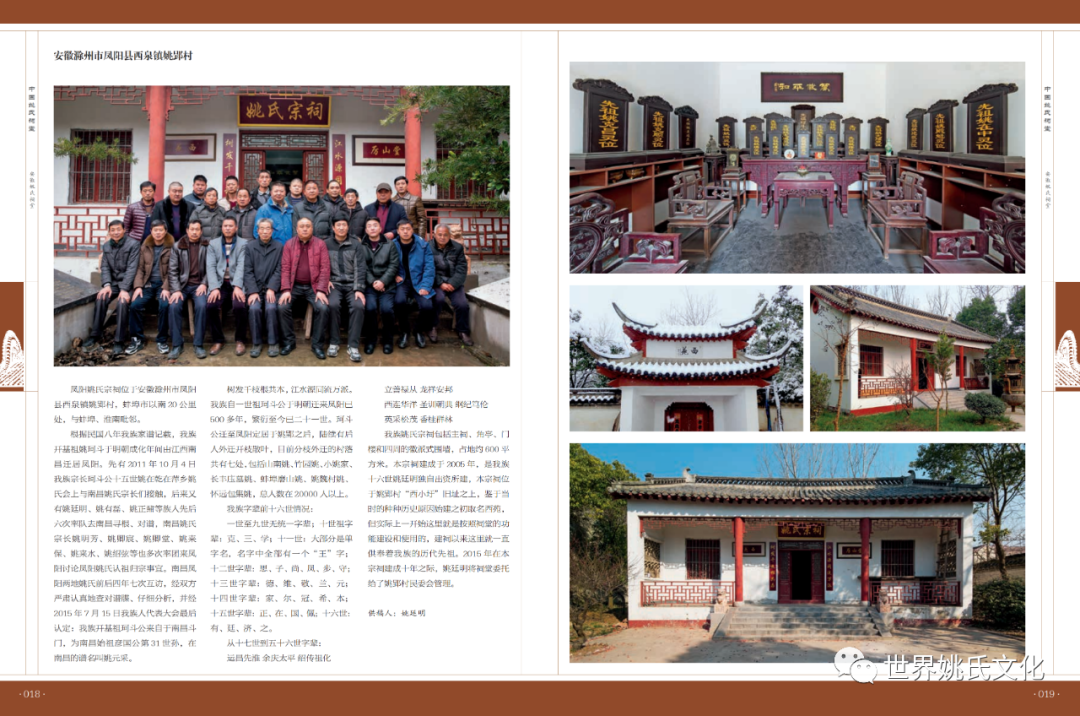 树发千枝根共本,江水源同流万派。我族自一世祖珂斗公于明朝迁来凤阳已500 多年,繁衍至今已二十一世。珂斗公迁至凤阳定居于姚郢之后,陆续有后人外迁开枝散叶,目前分枝外迁的村落共有七处,包括山南姚、竹园姚、小姚家、长丰庒墓姚、蚌埠磨山姚、姚魏村姚、怀远包集姚,总人数在 20000 人以上。