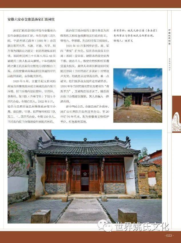 1929 年 5 月,立夏节起义胜利后商城县苏维埃政府成立商城县政治保卫分局,保卫分局内设侦察科、审讯科、事务科、保卫队(含看守所)下辖 5 个区代办处,全局近百人,1932 年 8 月,设赤南县原赤城县苏维埃政府保卫分局,设侦察、审讯、保管等科和保卫队及二、三、四区代办处,全局 130 余人,当时政治保卫分局就设在该姚氏宗祠。