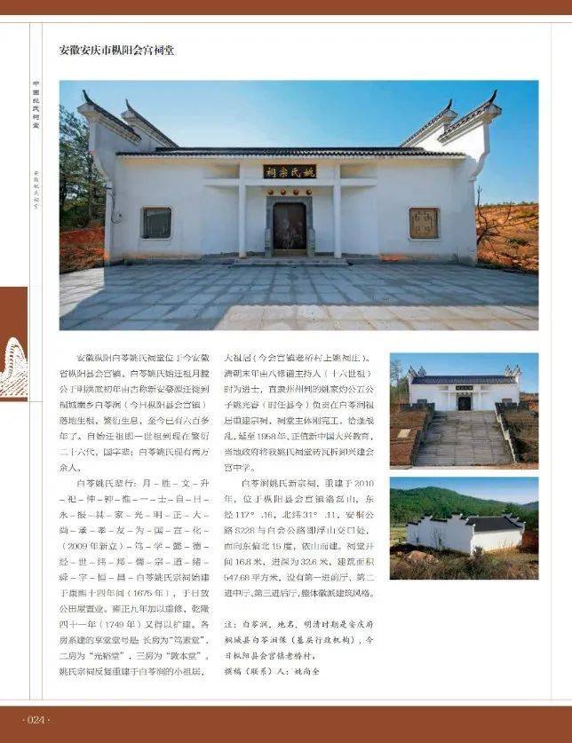 白苓涧姚氏新宗祠,重建于 2010年, 位 于 枞 阳 县 会 宫 镇 洛 磊 山, 东经 117° .16,北纬 31° .11,安桐公路 S228 与 白 会 公 路 即 浮 山 交 口 处,面向东偏北 15 度,依山而建。祠堂开间 16.8 米,进深为 32.6 米,建筑面积547.68 平方米,设有第一进前厅、第二进中厅、第三进后厅,整体徽派建筑风格。