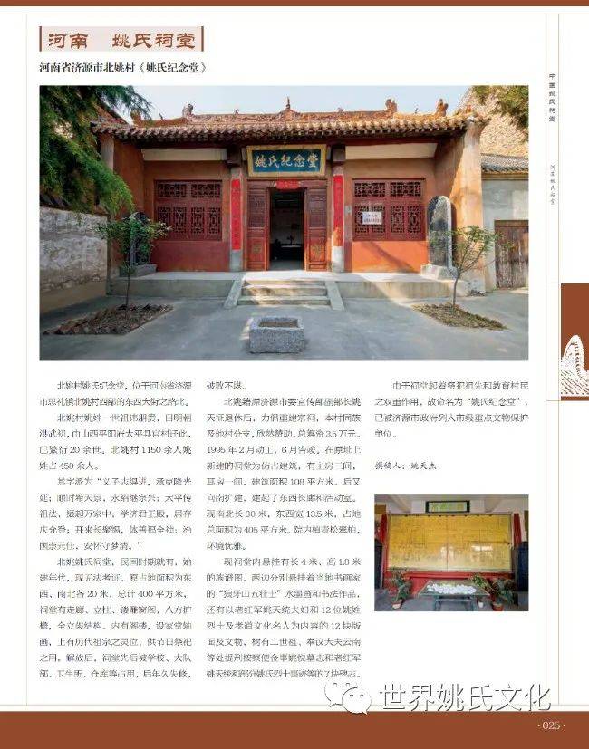 北姚籍原济源市委宣传部副部长姚天征退休后,力倡重建宗祠,本村同族及他村分支,欣然赞助,总筹资 3.5 万元。1995 年 2 月动工,6 月告竣。在原址上新建的祠堂为仿古建筑,有主房三间,耳房一间,建筑面积 108 平方米。后又向南扩建,建起了东西长廊和活动室。现南北长 30 米,东西宽 13.5 米,占地总面积为 405 平方米。院内植青松翠柏,环境优雅。