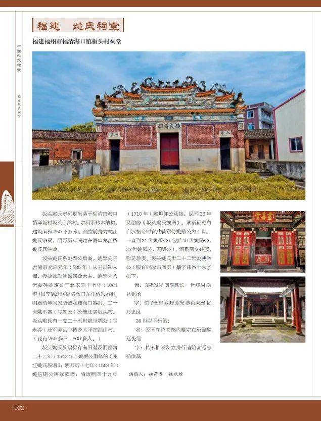 坂头姚氏族谱保存有旧谱及明嘉靖二十二年(1543 年)姚赓公重修的《龙江姚氏族谱》;明万历十七年(1589 年)姚应期公再修族谱;清康熙四十九年(1710 年)姚坦如公续修,民国 38 年又重修《坂头姚氏族谱》。该谱记载有自汉桓帝时官武骑常侍姚敷公为 1 世,一直到 21 世姚棨公(包括 16 世姚懿公、23 世姚凤公、天明公)。谱系图文并茂,弥足珍贵。坂头姚氏世二十二世姚朝举公(服官时改讳周臣)纂字讳各十六字如下: