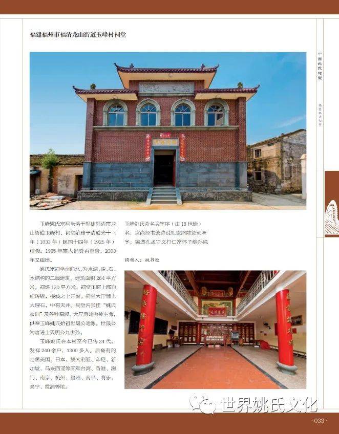 玉峰姚氏宗祠坐落于福建福清市龙山街道玉峰村。祠堂始建于清道光十三年(1833 年)民国十四年(1925 年)重修。1985 年族人捐资再重修,2003年又重建。