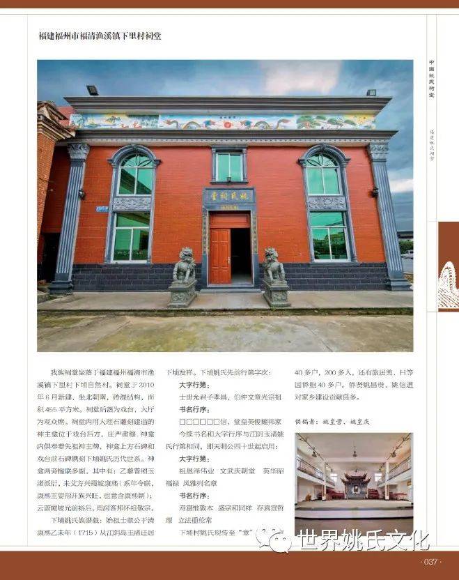 我族祠堂坐落于福建福州福清市渔溪镇下里村下埔自然村。祠堂于 2010年 6 月新建,坐北朝南,砖混结构,面积 455 平方米。祠堂后落为戏台,大厅为观众席。祠堂内用大理石雕刻建造的神主龛位于戏台后方,庄严肃穆 . 神龛内供奉着先祖神主牌,神龛上方石碑和戏台前石碑镌刻下埔姚氏历代世系。神龛两旁楹联多副,其中有:乙藜普照玉渚派衍,未艾方兴霞坡康熙(系年令联,康熙主要指开族兴旺,也意含康熙朝);云蔚霞坡光前裕后,雨润客邦怀祖敬宗。