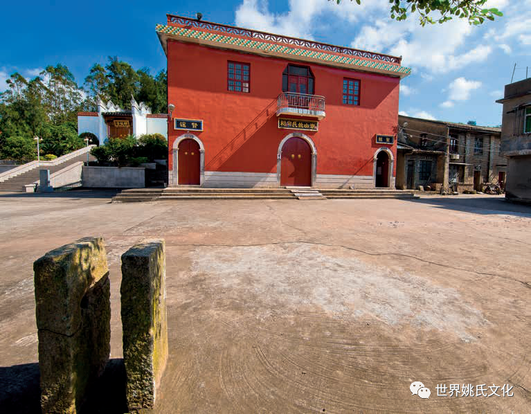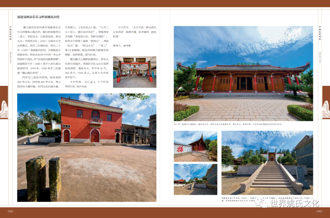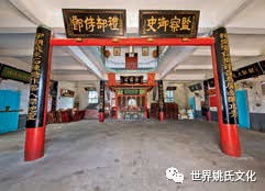祠堂为二层砖木结构,建筑面积350 平方米,祠堂埕 300 平方米,竖立四对双斗旗杆碣。宗祠文化内涵丰富,福建福州市长乐文岭镇姚坑祠堂代有闻人。《长乐县志》载:“七世二元十进士,姚坑克世其家”。神龛两旁古祠联“宋室状元府,明时宰相家”。祠堂大厅四壁上遍悬“荣国公”、两面“状元”匾、“参议大夫”、“进士”等 14 面匾额。镏金的祠联与匾额交相辉映,金碧辉煌,蔚为壮观。