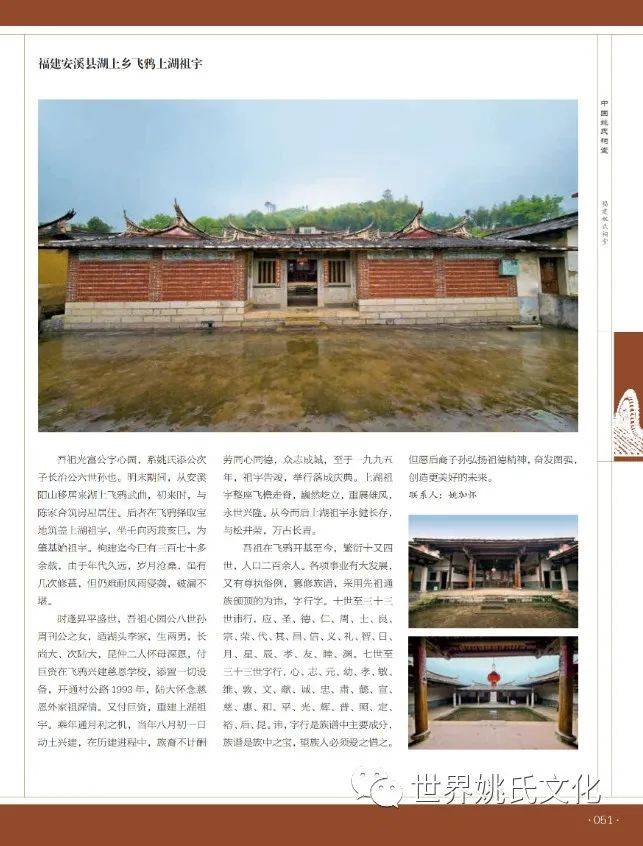 吾祖光富公字心园,系姚氏添公次子长治公六世孙也。明末期间,从安溪阳山移居来湖上飞鸦武曲,初来时,与陈家合筑房屋居住。后者在飞鸦择取宝地筑盖上湖祖宇,坐壬向丙兼亥巳,为肇基始祖宇。枸建迄今已有三百七十多余载,由于年代久远,岁月沧桑,虽有几次修葺,但仍难耐风雨侵袭,破漏不堪。
