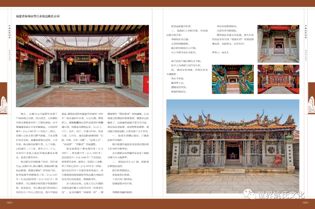 钱仓姚氏宗祠始建于何时,因年湮代远,史载不详,难以稽考。依据闽南“建祠必修谱,修谱必建祠”的传统习俗,参考族谱中明朝隆庆丁卯(公元 1567年)以及民国癸酉(公元 1932 年)两份谱序,可以推断宗祠首建于明嘉靖时期,甚至更早,可以确定我们的祠堂已有四百五十年以上的历史。图片中富丽福建省泉州市晋江市钱仓姚氏宗祠堂皇、雄伟壮观的祠堂是共和庚午(1990年)钱仓海内外乡贤,同心同德,群策群力,慷慨解囊耗巨资於原址依旧制翻建而成。祠堂坐向巽乾巳亥,以大门、下厅、天井、前厅、厅堂为中轴,纵深三进,五开间 ,是典型的闽南风格“石鼓、木柱、斗拱、瓦砌”、“出砖入石”、“燕尾脊”“宫殿式”传统建筑。