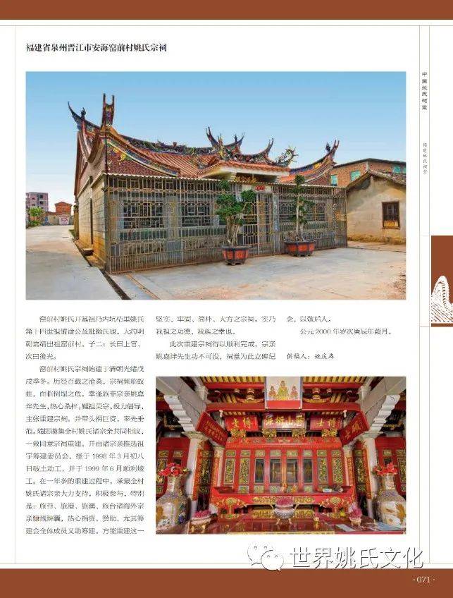 窑前村姚氏宗祠始建于清朝光绪戊戍季冬。历经百载之沧桑,宗祠频临蚁蛀,面临倒塌之危。幸逢旅菲宗亲姚嘉坢先生,热心桑梓,耀祖荣宗。极力倡导,主张重建宗祠。并带头捐巨资,率先垂范。隨即邀集全村姚氏诸宗亲共同相议,一致同意宗祠重建。并由诸宗亲推选祖宇筹建委员会,择于 1998 年 3 月初八日破土动工,并于 1999 年 6 月顺利峻工。在一年多的重建过程中,承蒙全村姚氏诸宗亲大力支持,积极参与,特别是:旅菲、旅港、旅澳、旅台诸海外宗亲慷慨解囊,热心捐资,赞助,尤其筹建会全体成员义助筹建,方能重建这一坚实、牢固、简朴、大方之宗祠。实乃我祖之功德,我族之幸也。