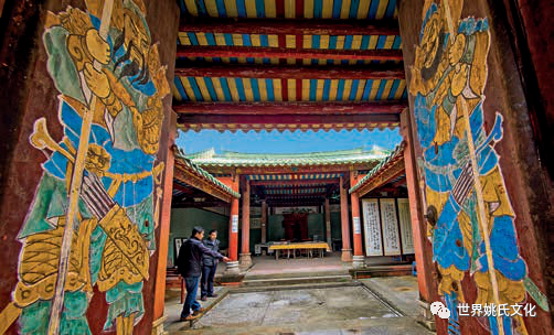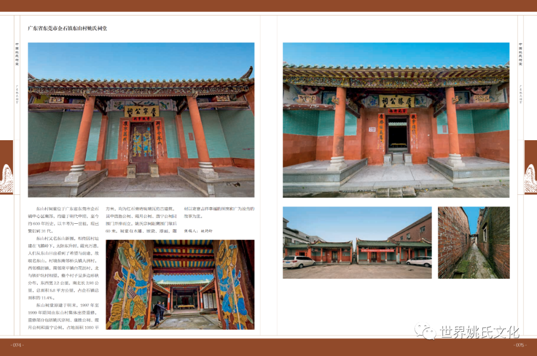 东山祠堂原建于明末,1997 年至1999 年期间由东山村集体出资重修,重修部分包括姚氏宗祠、康胜公祠、霞月公祠和康宁公祠,占地面积 1080 平方米,均为红石青砖琉璃瓦仿古建筑,其中康胜公祠、霞月公祠、康宁公祠同围门并排而立,姚氏宗祠距离围门靠后60 米。祠堂有木雕、嵌瓷、漆画,题材以寄意吉祥幸福的图案和广为流传的故事为主。