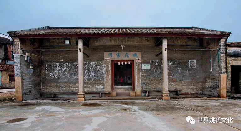 宗祠坐北朝南,三间两进,木质结构,其总面阔 11.8 米,建筑占地 235平方米。由于当时条件限制,姚氏宗祠筹措资金相当困难,建成的宗祠面积并不大。中路建筑是人字封火山墙,硬山顶,灰博古脊,绿灰筒瓦,夯土墙基,尽显岭南建筑特色。头门面阔三间 11.8米,进深两间 6.1 米共十一架。后堂面阔三间 11.8 米,进深三间 7.4 米共十三架,杉木金柱。后堂前带两廊,六架卷棚。宗祠内墙面改刷石灰水。