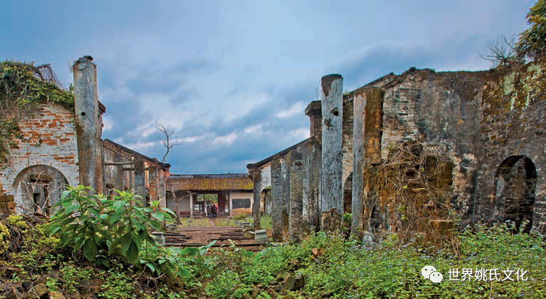 然而,岁月沧桑,往昔的大宗祠已不复存在。1938 年日军飞机炸塌内堂。“文革”期间被造反派拆毁了广场上祖先的功名标志和整个大堂。今天的大宗祠几乎一片废墟,只剩下残破不全的大门厅(前堂)默默地暗示昔日的不凡。