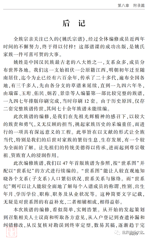 姚氏历史源远流长,家族厚重的历史需要族人接力记录编纂。而今,我们这一代以绵薄之力,对自迁徙始祖以来的一段历史铸以成册。但我们这个家族伴随着中华民族的繁荣进步而日益兴盛,不断演绎着新的历史。这就给我族后世提出了新的编谱要求,所以我们作为第二代续谱人,殷切地希望一代一代的后来者,自告奋勇地担当起族谱的编纂大任。若能做到每百年续修两次,将是族之幸事!我们坚信,后续之谱所呈现的内容一定会更全面更详实,一定会成为水准更高的历史典籍。