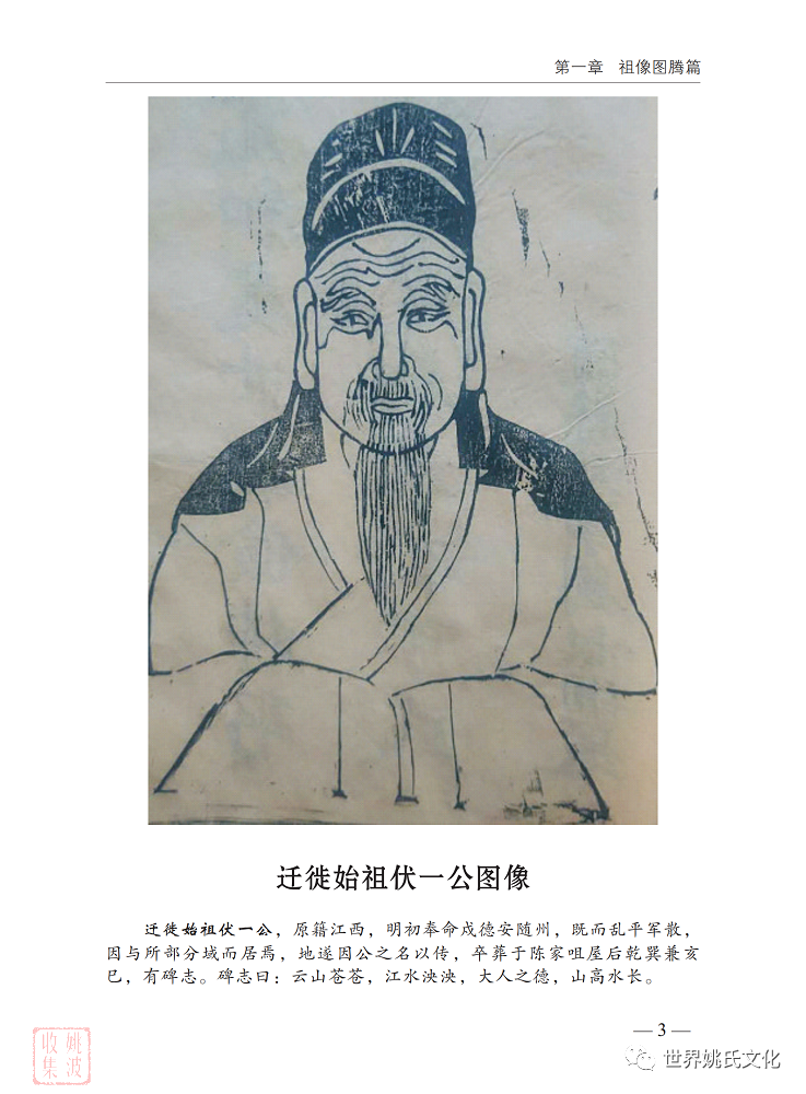 吾先世自虞舜産於姚墟遂以姚爲氏此姚姓之所由昉也厥后光史册者代不乏人姑闕弗叙非略也特遠而無征也若最近而有征者其惟自有明之伏一公始公於洪武二年爲緑旗隊長奉命戍德安以游騎分巡隨州涢川鄉歸仁里見山水之靈秀俗尚之純良既而散軍遂 至是構廬而居焉一傳而生廷湖ꎬ再傳而廷湖生國賢囯清囯棟囯梁此吾族四大房之所由來也四百八十余年聚族而居從無一户一丁遷居异鄉洪楊役后民力虚耗吾族携眷南下者往往有人越年既久縣治既分聲氣即不通喜不慶憂不吊冠婚不告喪祭不助有無不相通患難不相顧不惟長幼尊卑不叙而顔貌亦不相識矣數傳而后其不族人而至於途人者幾希鈞特憂之乃集族内元臣迎南顯亭璧亭囯臣行之瑞霖炳若正德培德等倡議修譜均極贊成無一彼此推諉之語循即從事編輯凡吾祖一脉之后無論散居何地苟爲所知無不一一詳載尋流溯源合其萬以歸於一某房與某支同源也某支系某祖分出也世系年表村居墓志行實傳贊凡例規條無不了如指掌朗若列眉由近今以溯往昔其人之懿行芳徽存殁年月一展卷而如在目前將見生者别其昭穆而行慶吊死者識其邱墓以祀春秋親者日以親疏者不致遠共敦一本之愛而不至視族人如秦越者其在斯譜歟夫譜而既修矣惟冀吾族秀者横經樸者負耒崇孝友而黜回邪敦樸素以戒奢華家業詩書無或一丁不識之子户稱殷富無或二釜不給之人是則余之所殷殷馨香祝禱者也