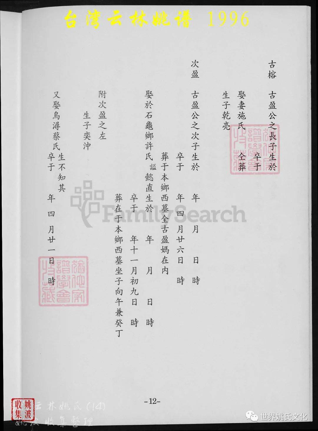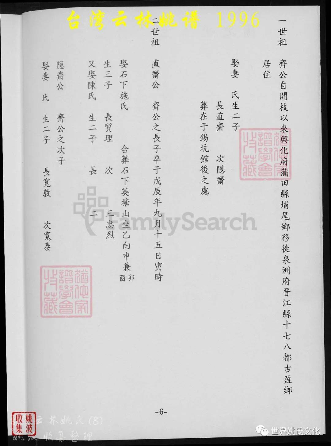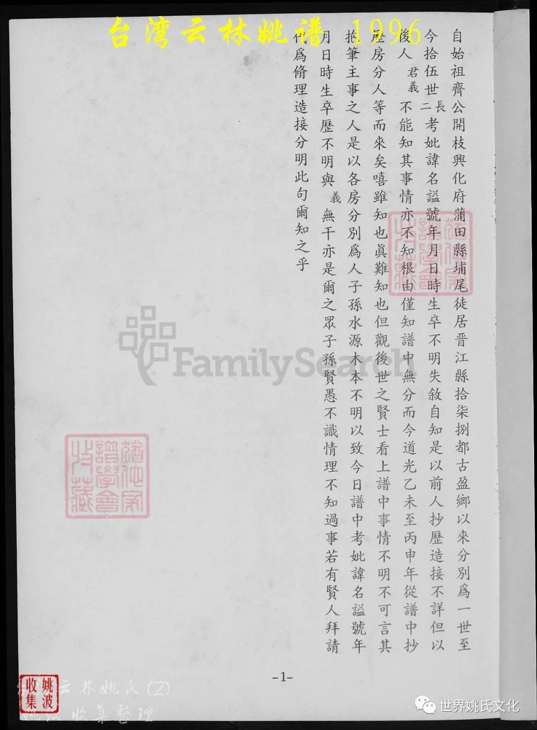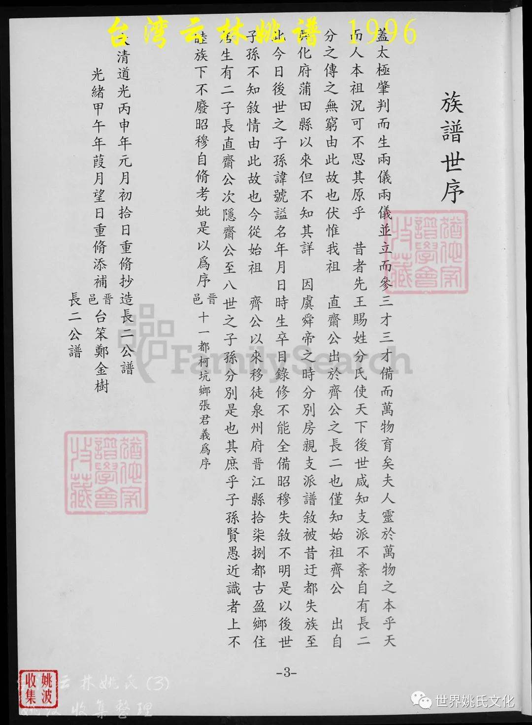 自始祖齐公开枝兴化府蒲田县埔尾徒居晋江县拾柒捌都古盈乡以来分别为一世至今拾五世长二考妣讳名谥号年月日时生卒不明失叙自知是以前人抄历造接不详但以后人君义不能知其事情亦不知根由僅知谱中无分而今道光乙未至丙申年從谱中抄历房分人等而来矣嘻虽知也真难知也但观后世之贤士看上谱中事情不明不可言其抱笔主事之人是以各房分别为人子孙水源木本,不明以致今日谱中考妣讳名谥号年月日时生卒历不明与 义 无干亦是尔之众子孙贤愚不识情理不知过事若有贤人拜请代为修理造接分明此句尔知之乎